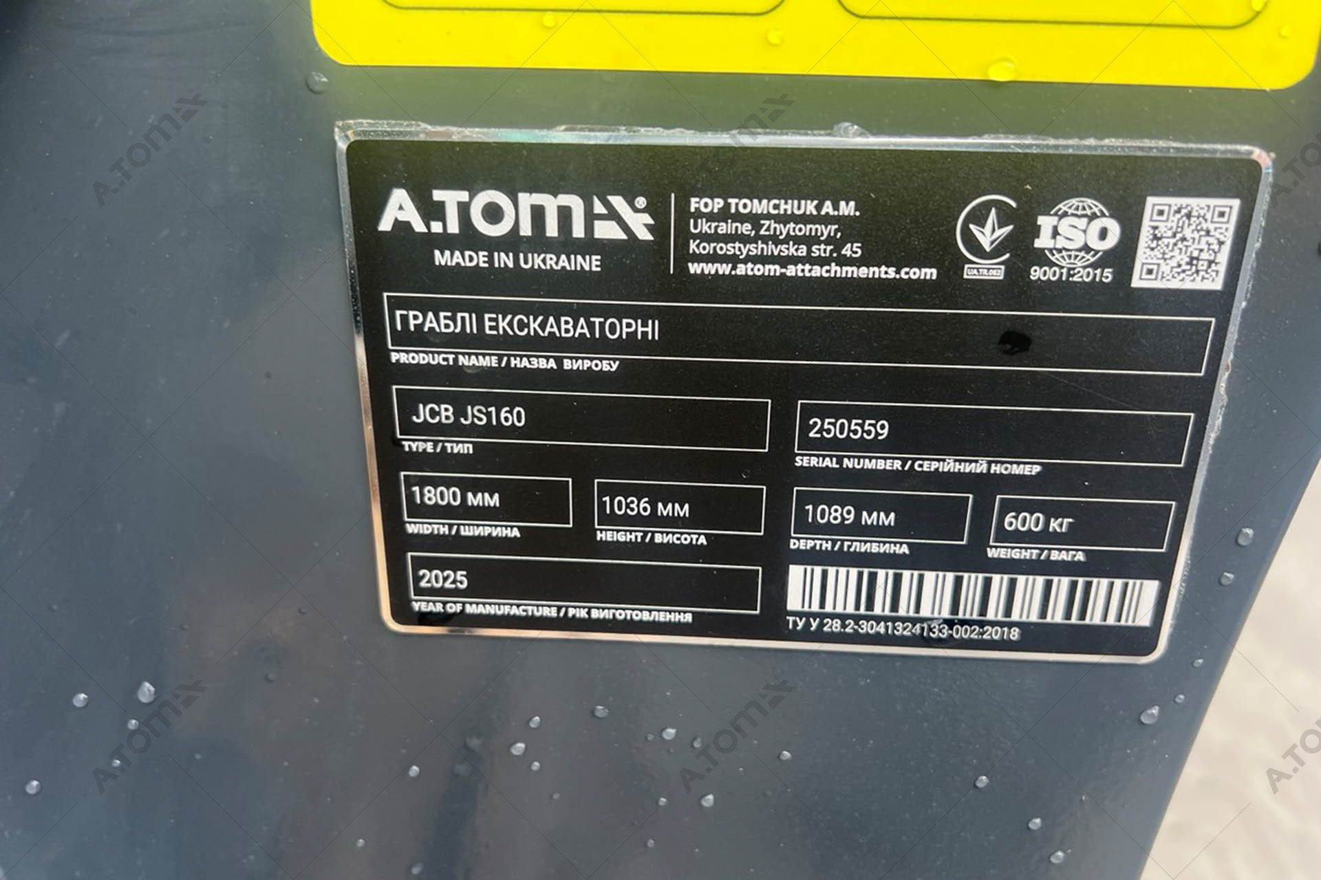 Экскаваторные грабли A.TOM. Ширина – 1800 мм. Высота – 1036 мм. Глубина – 1089 мм.