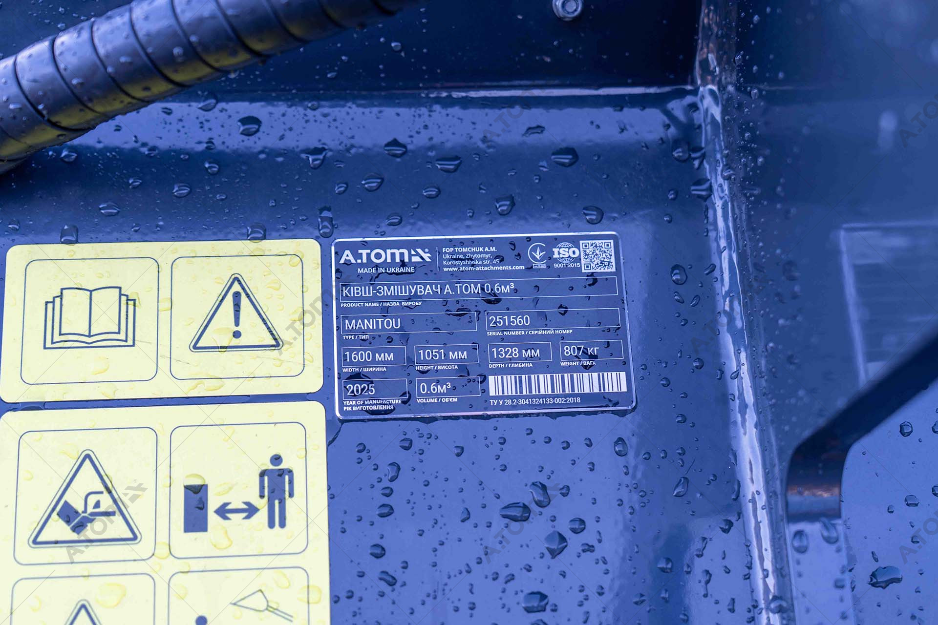 Ківш-змішувач А.ТОМ 0,6 м3 (для бетону) для телескопічних та фронтальних навантажувачів – виготовлений з конструкційної сталі підвищеної міцності S355 та Hardox 450. Призначений для змішування, а також транспортування будівельних сумішей, розчинів, бетону, сільськогосподарських добрив, комбікормів та ін. Особливості: